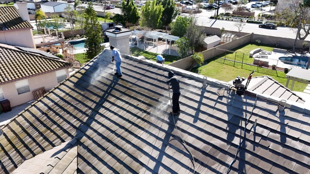 Roof pressure washing removes moss and grime, restoring your roof’s look.